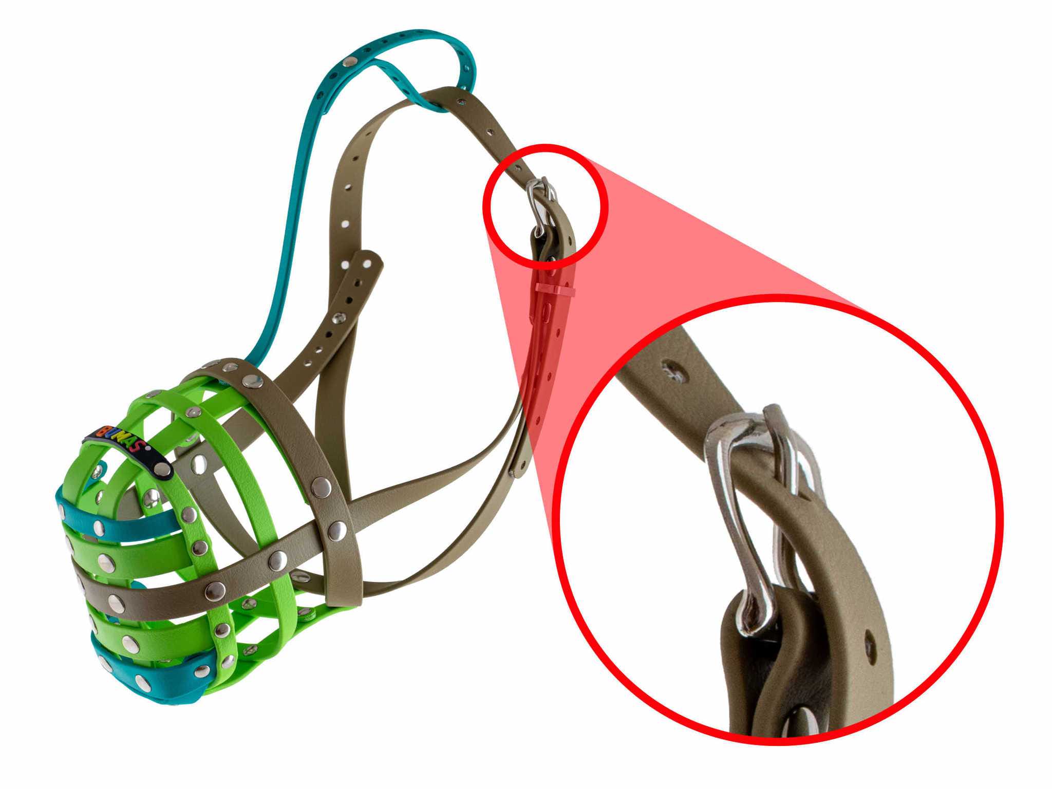 Jeder BUMAS Maulkorb ist standardmäßig mit einem Kunststoff Klick-Verschluss ausgestattet. Optional gibt es auch eine Schnalle aus Metall, die den Nackenriemen wie ein Gürtel variabel verschließt. Praktisch bei Hunden mit starkem Fellwuchs. Empfohlen für alle Hunde, die regelmäßig geschert werden müssen.